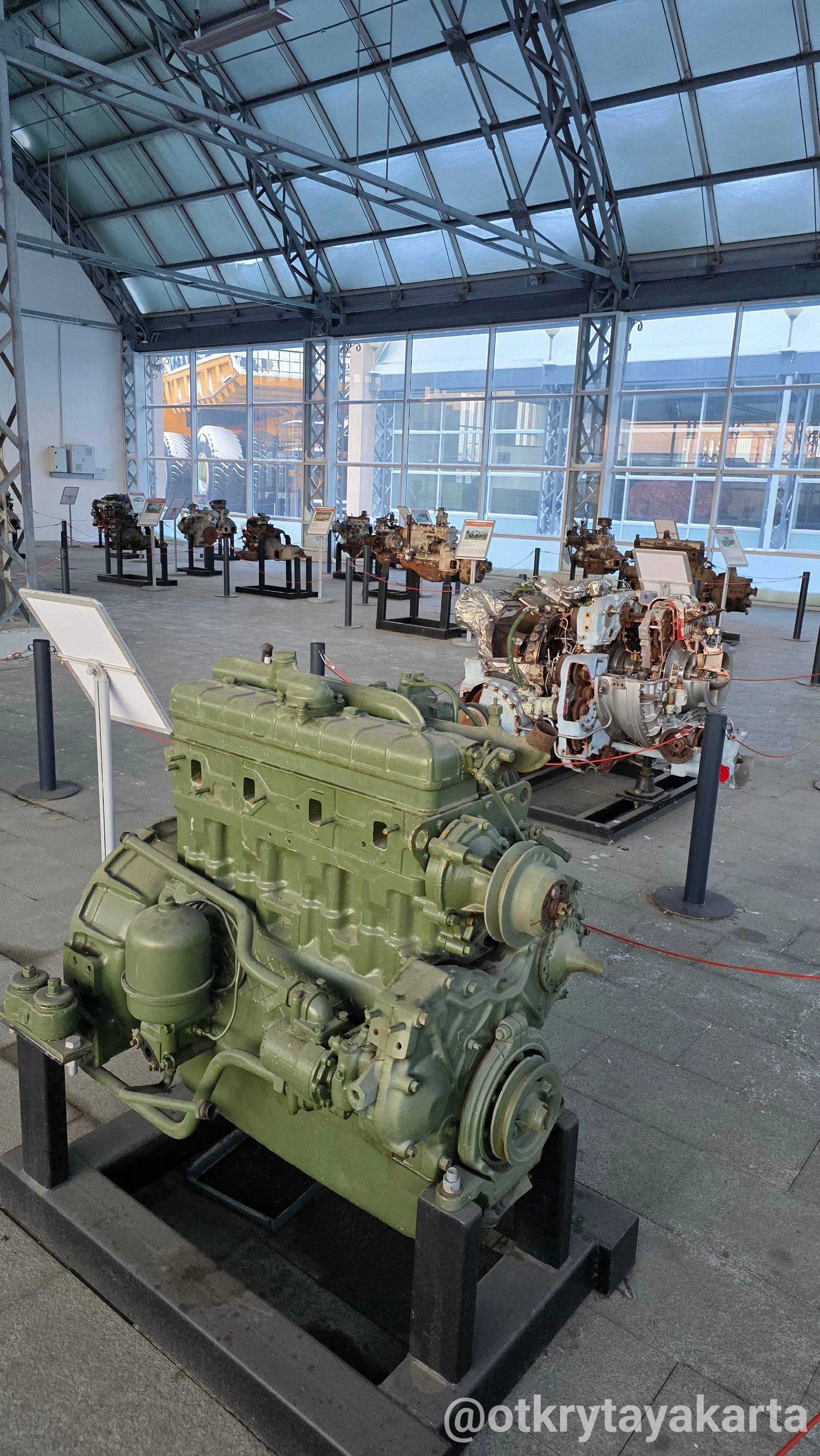 Экспозиция двигателей охватывает моторы карьерных самосвалов, легковых автомобилей, авиации и тракторов — от довоенных моделей до современных.