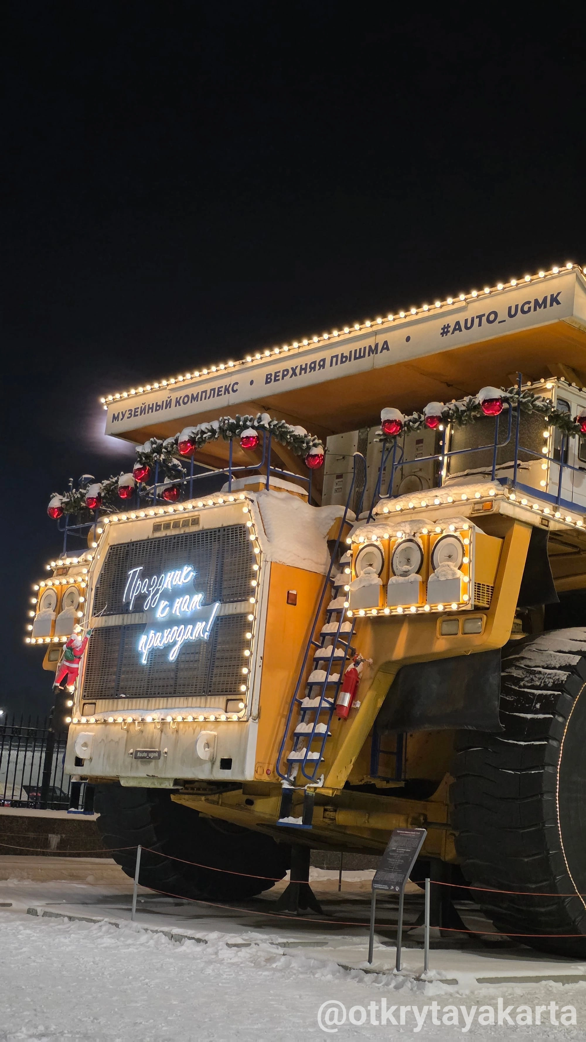 Новогоднее оформление. В праздничный период БелАЗ украшают как новогодний грузовик. Для оформления используют 800 лампочек и 150 метров гирлянд, на борту размещается светящаяся надпись «Праздник к нам приходит».