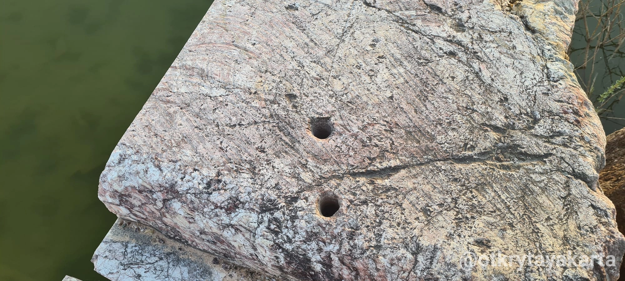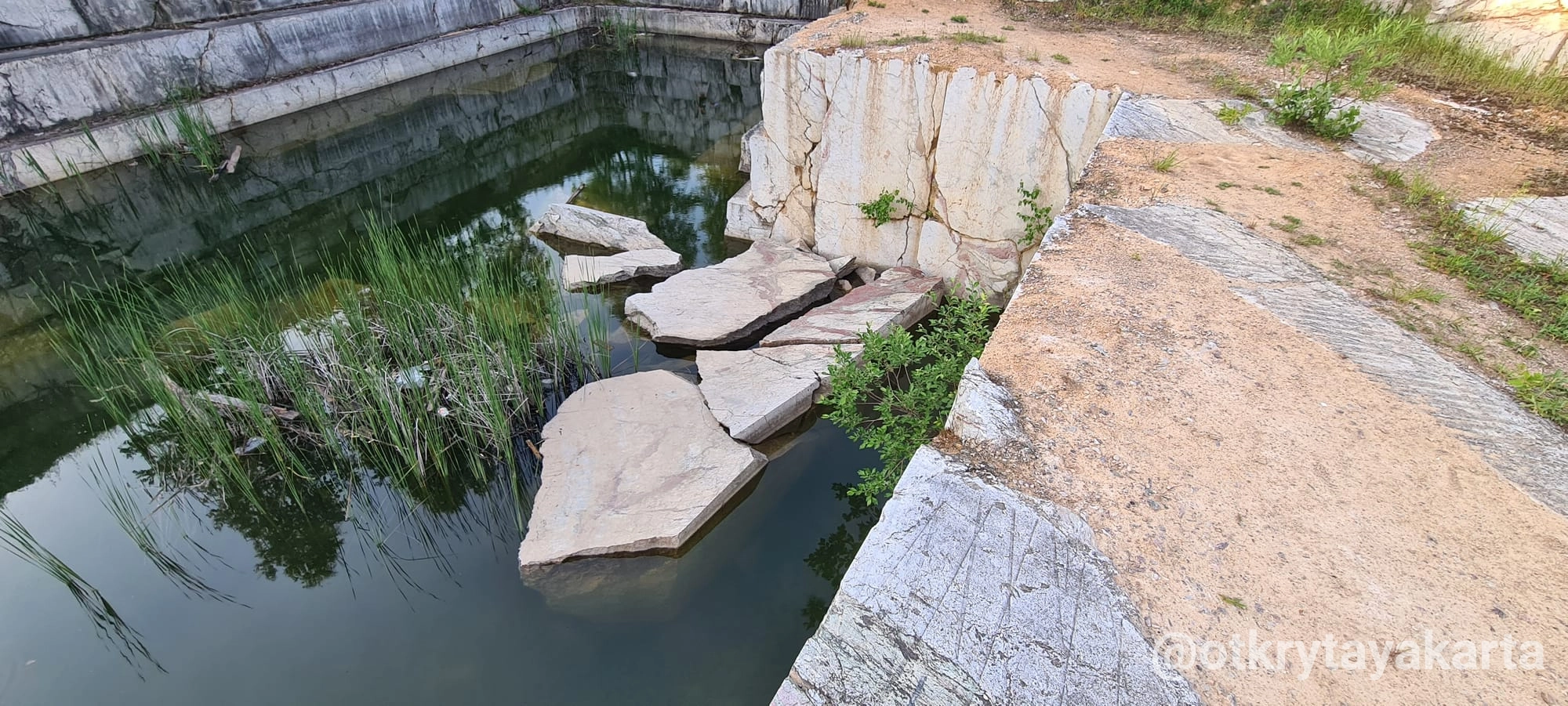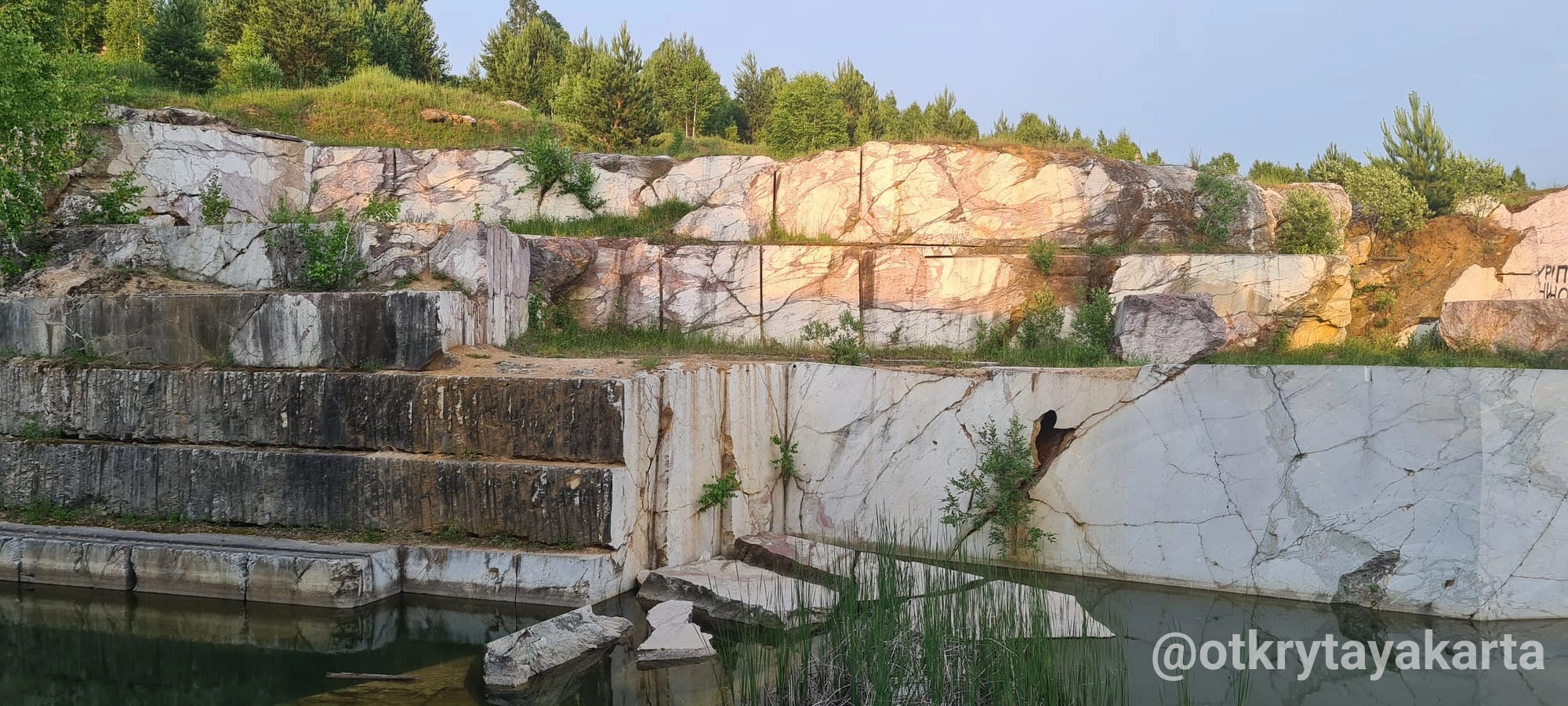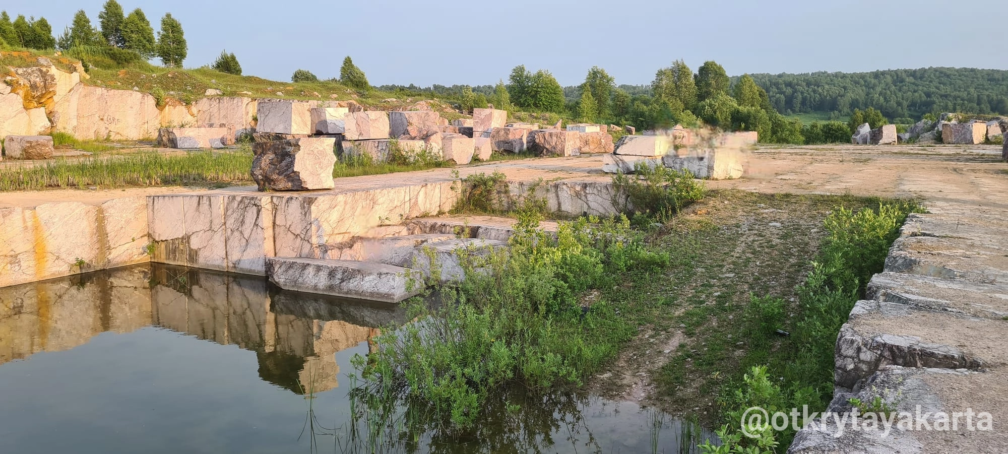Некоторые глыбы заботливо уложены на доски. По краям карьера сохранились остатки фонарных столбов. Вниз, где сейчас вода, ведет спуск для техники