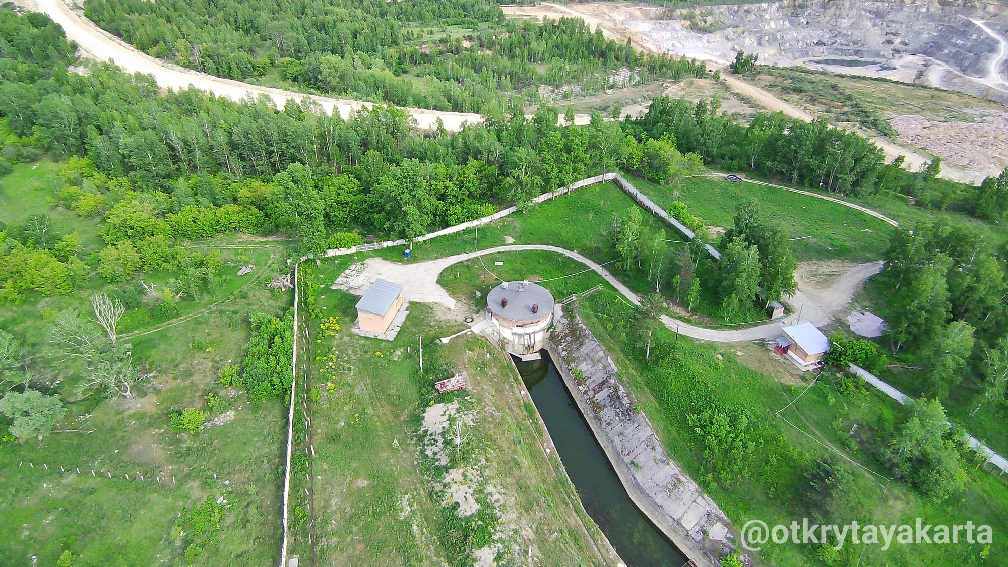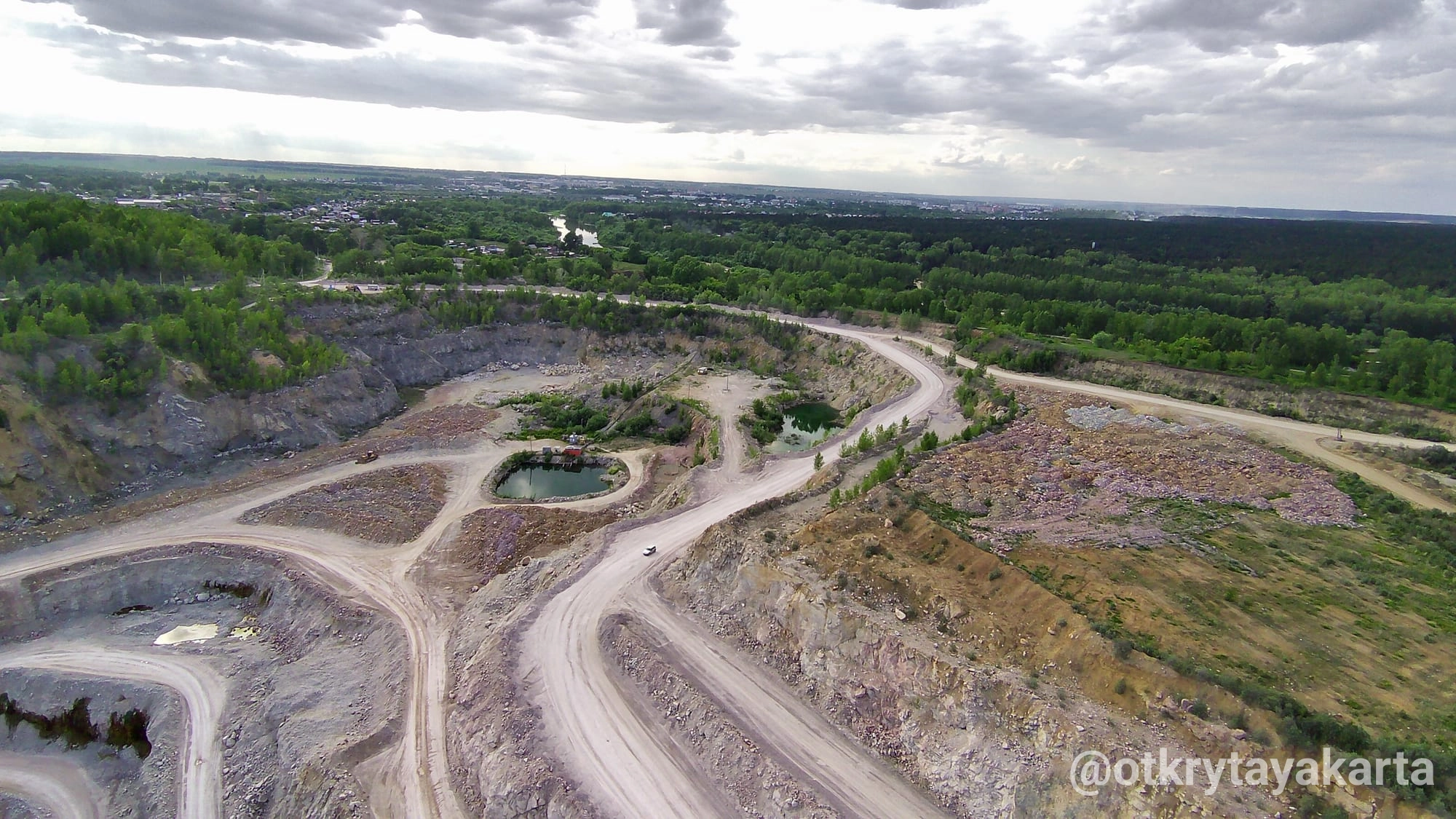 Виды с высоты на карьер и окрестности. Так мы обнаружили что-то типа шлюзов на реке