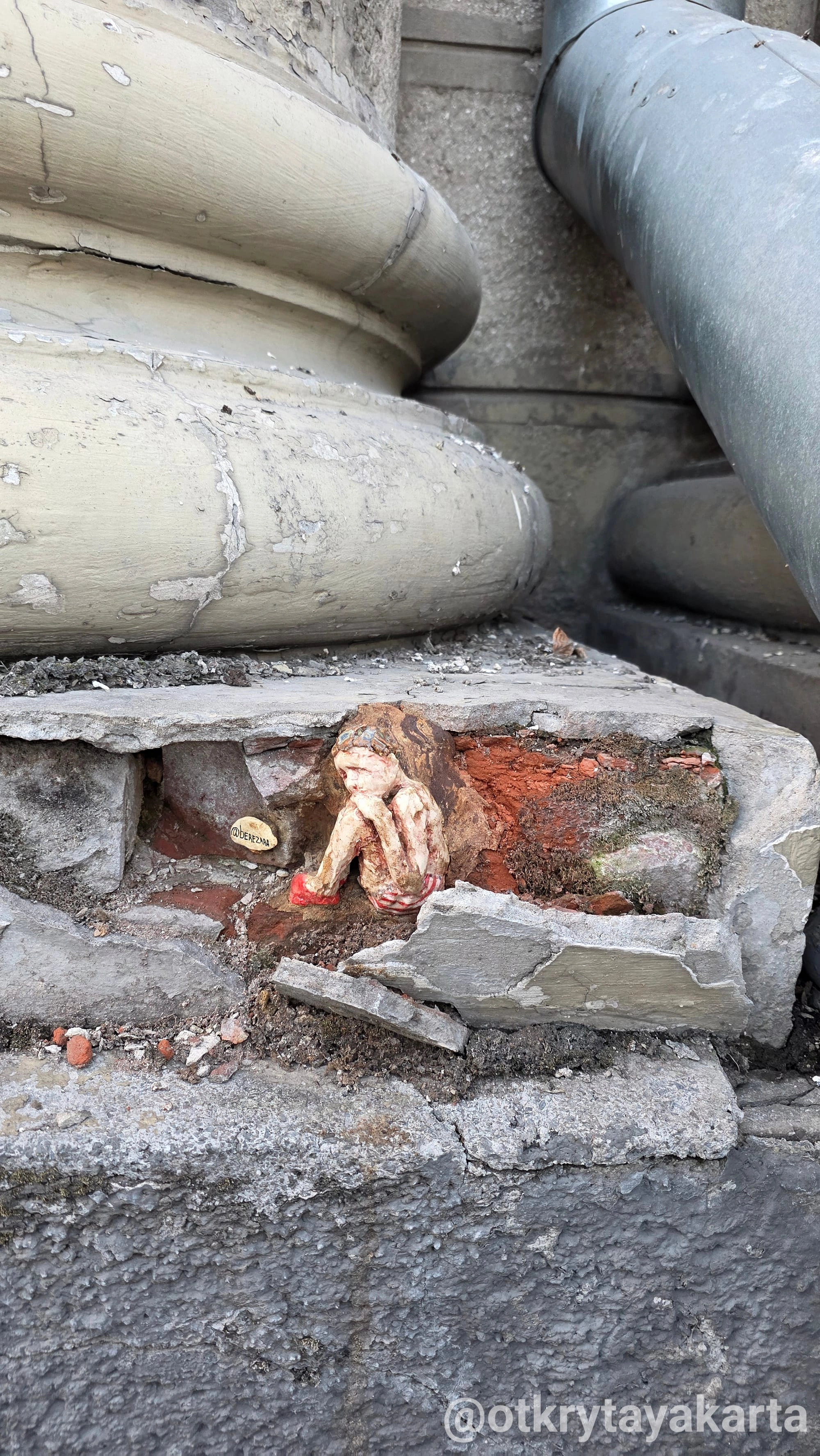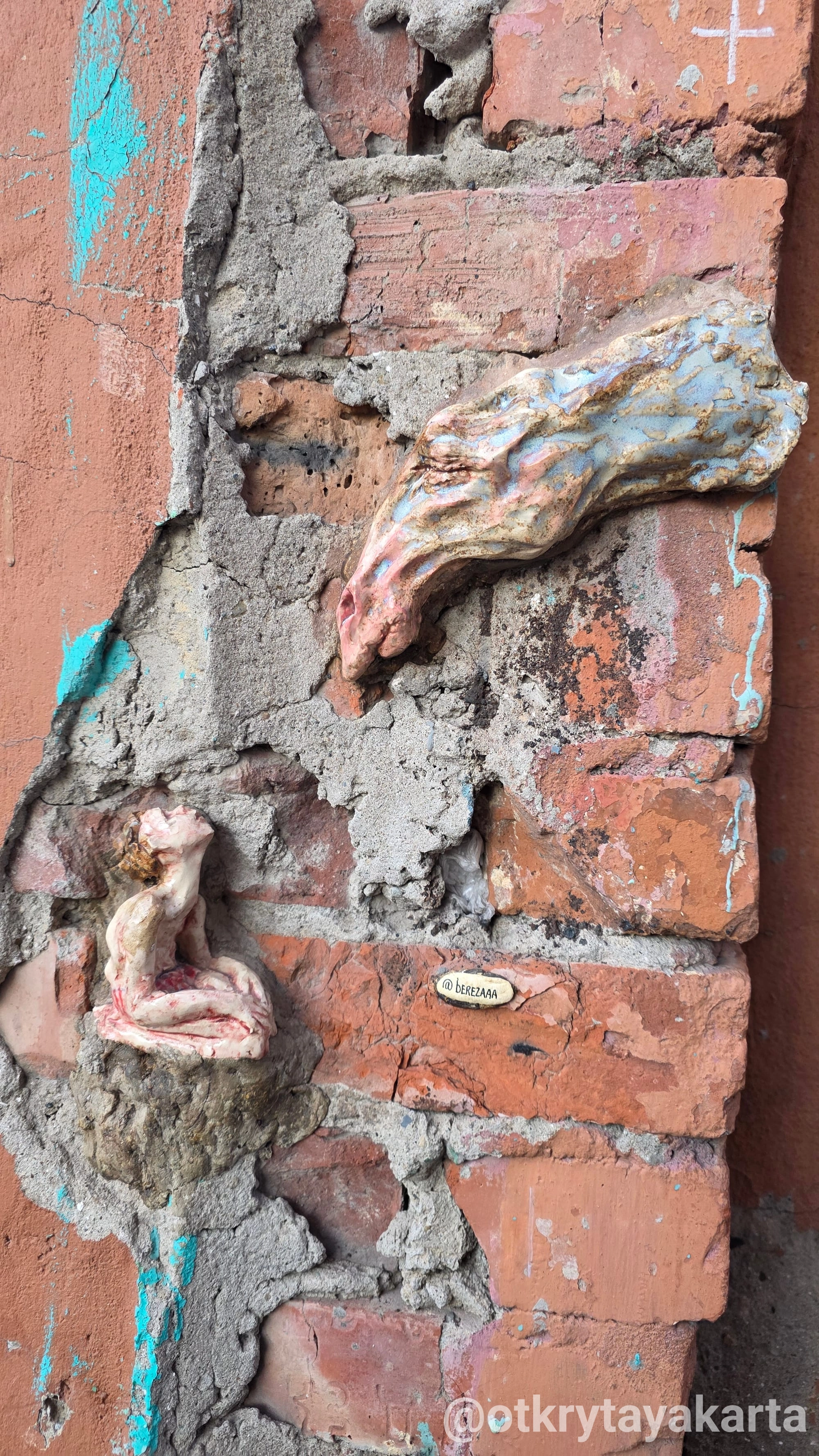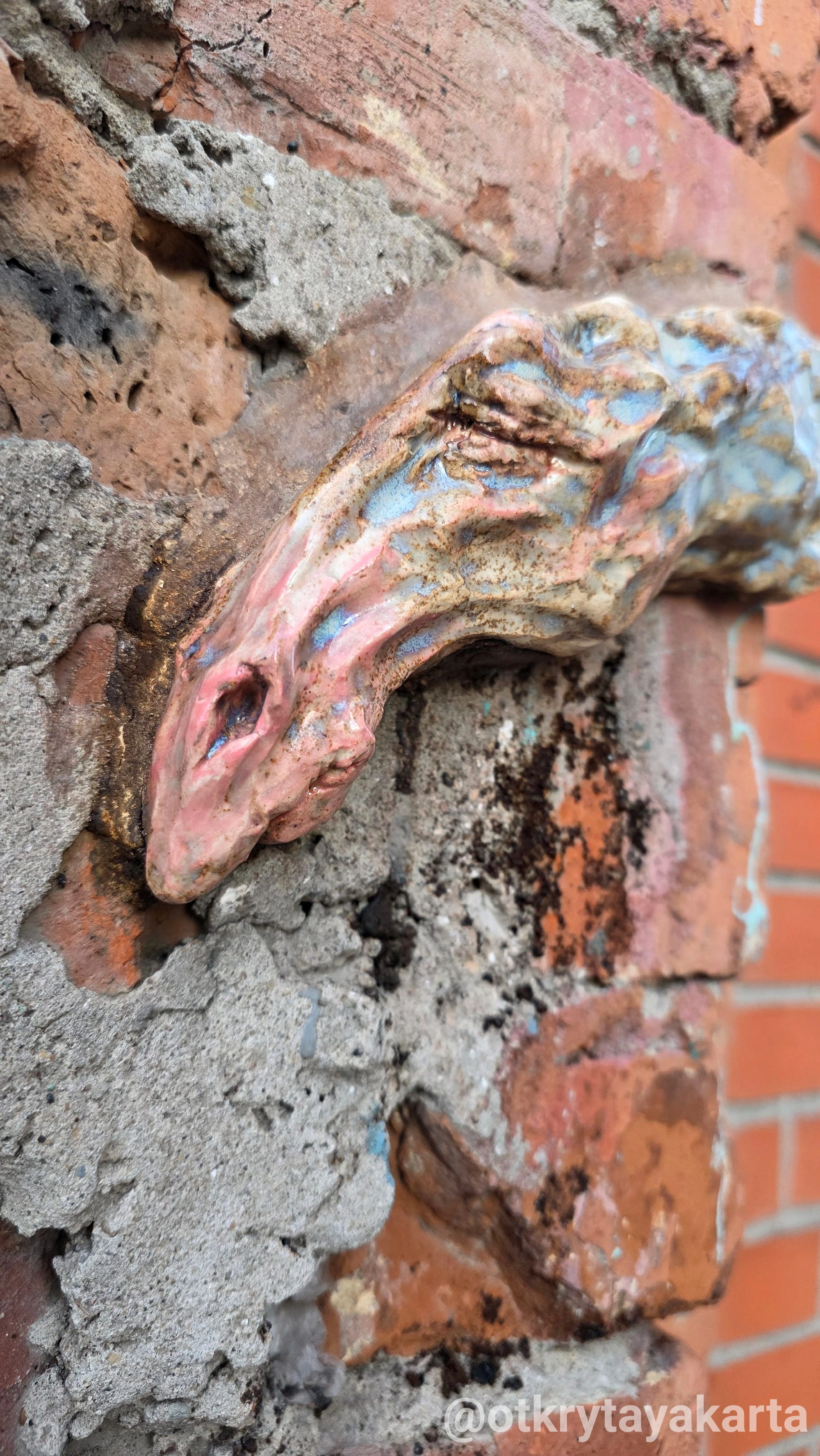 Теперь она сначала находит трещину или выбоину. Запоминает адрес. Потом возвращается с сырой глиной и придаёт скульптуре форму конкретного отверстия — или лепит прямо на месте. После забирает, обжигает, покрывает глазурью. И уже готовая работа точно «состыковывается» со своим местом.