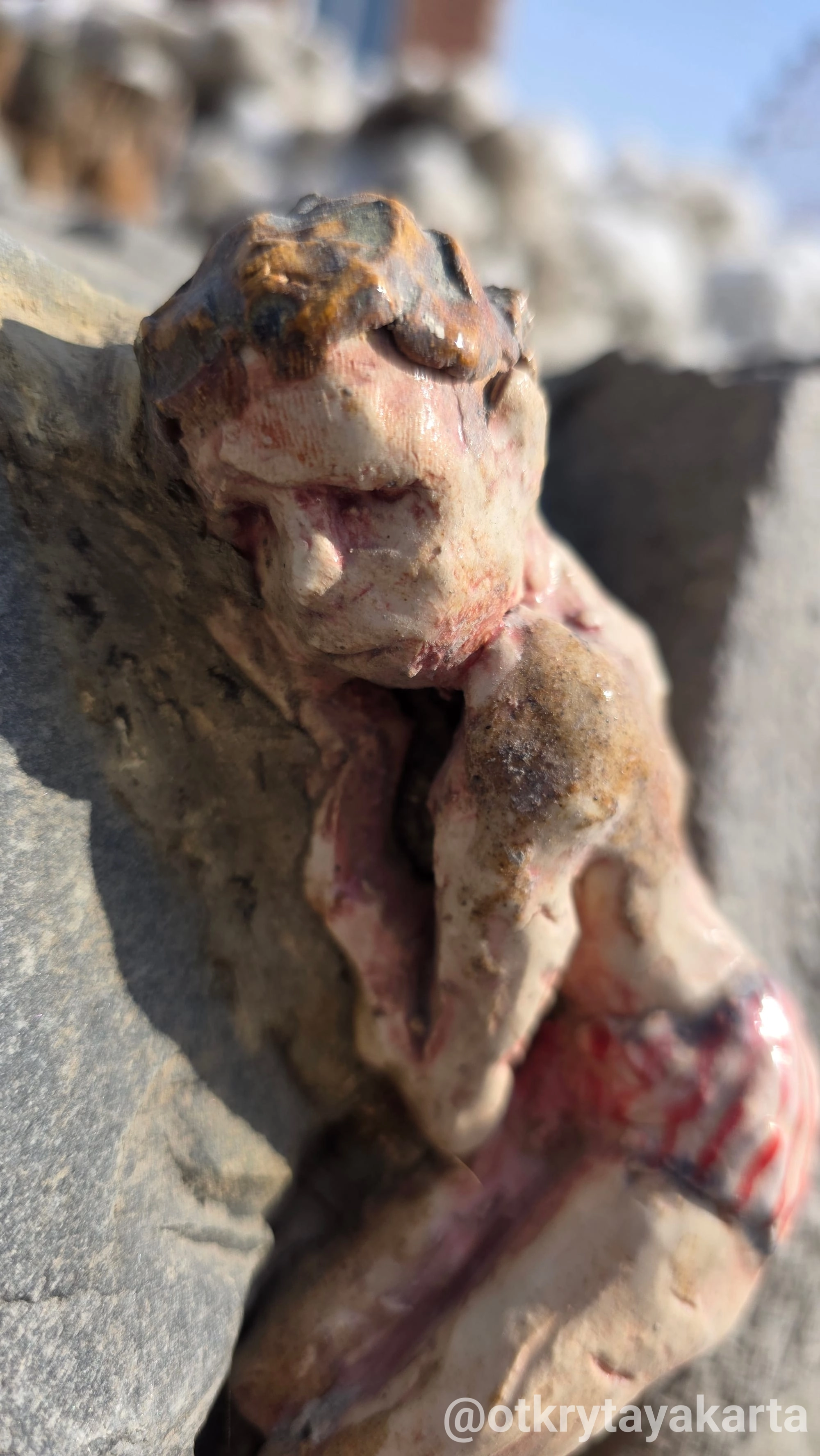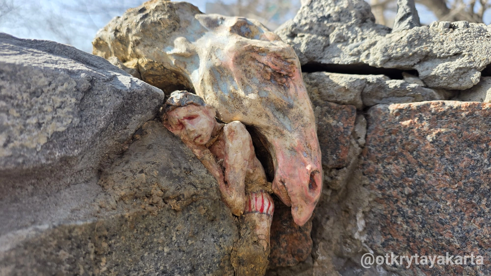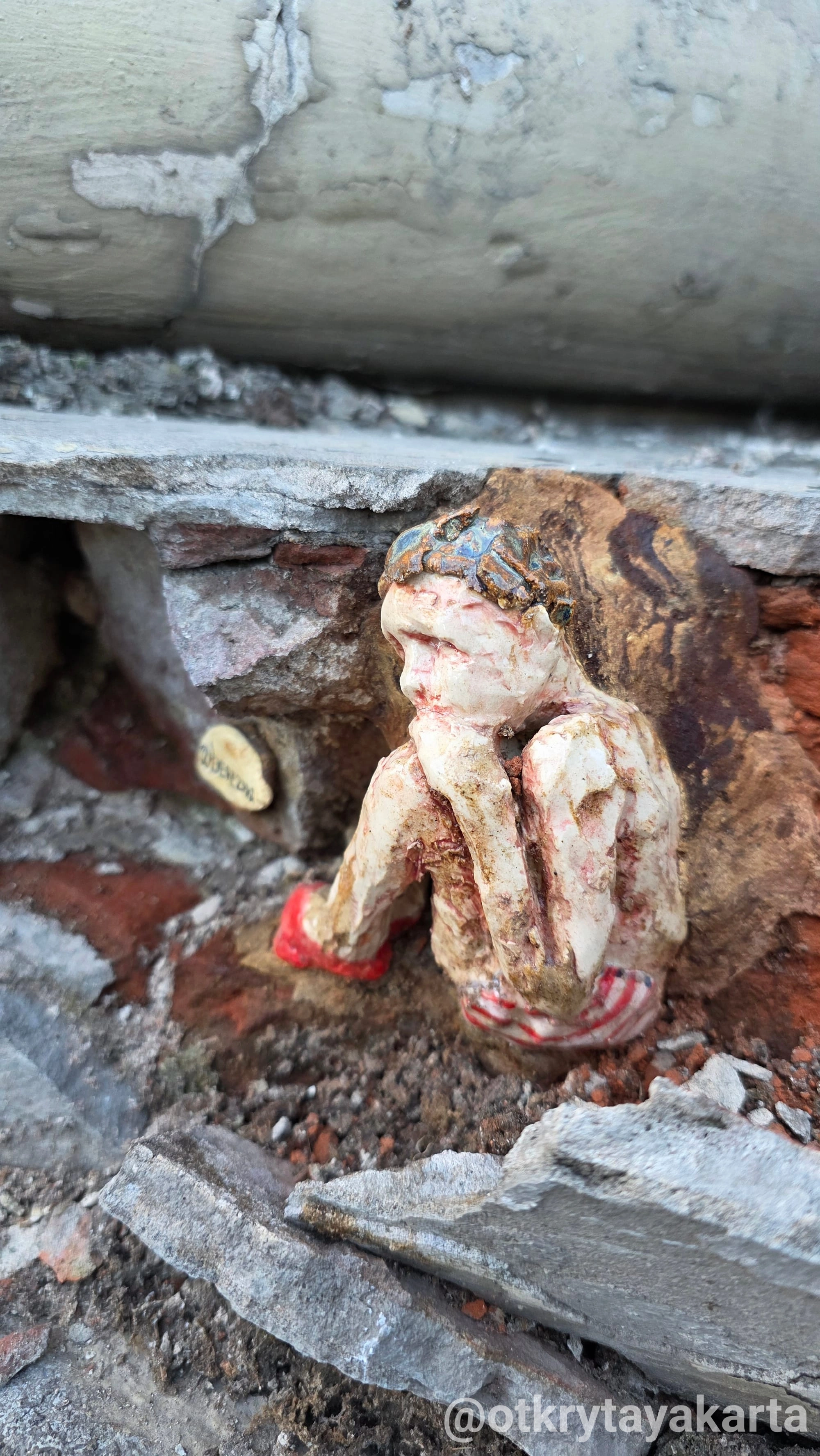 Теперь она сначала находит трещину или выбоину. Запоминает адрес. Потом возвращается с сырой глиной и придаёт скульптуре форму конкретного отверстия — или лепит прямо на месте. После забирает, обжигает, покрывает глазурью. И уже готовая работа точно «состыковывается» со своим местом.