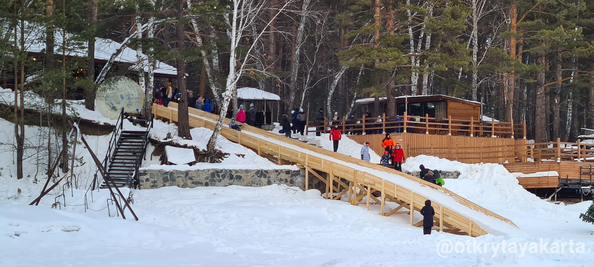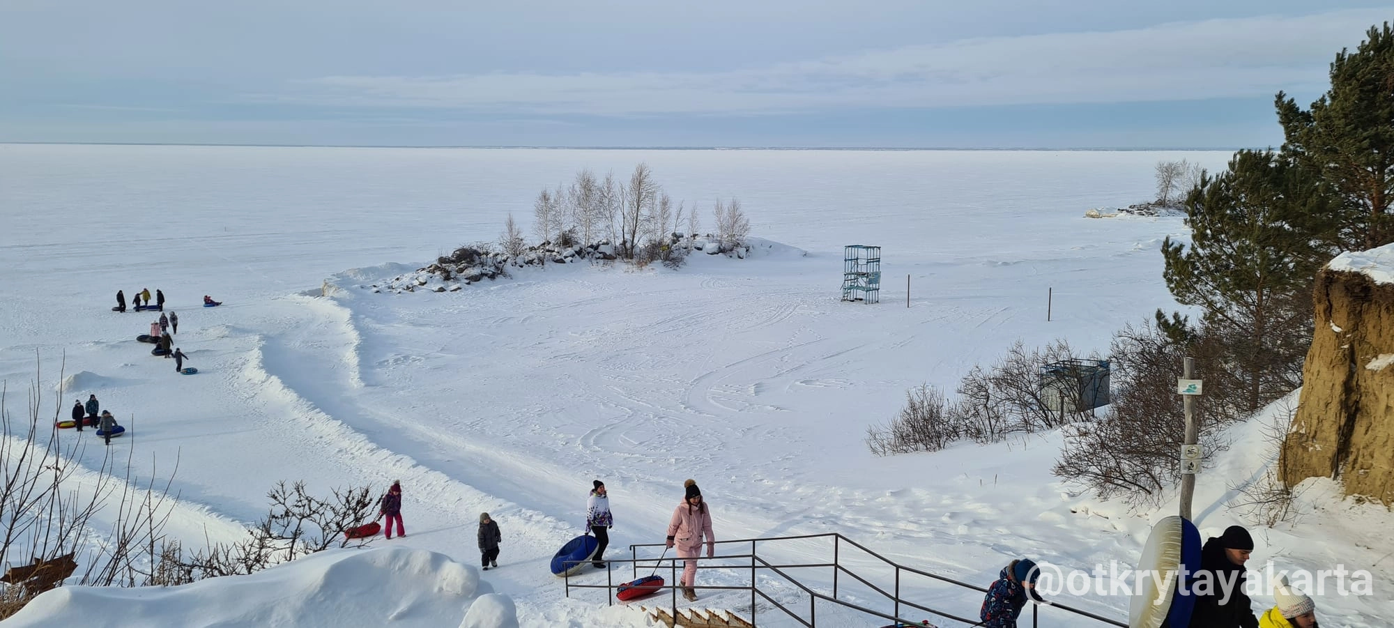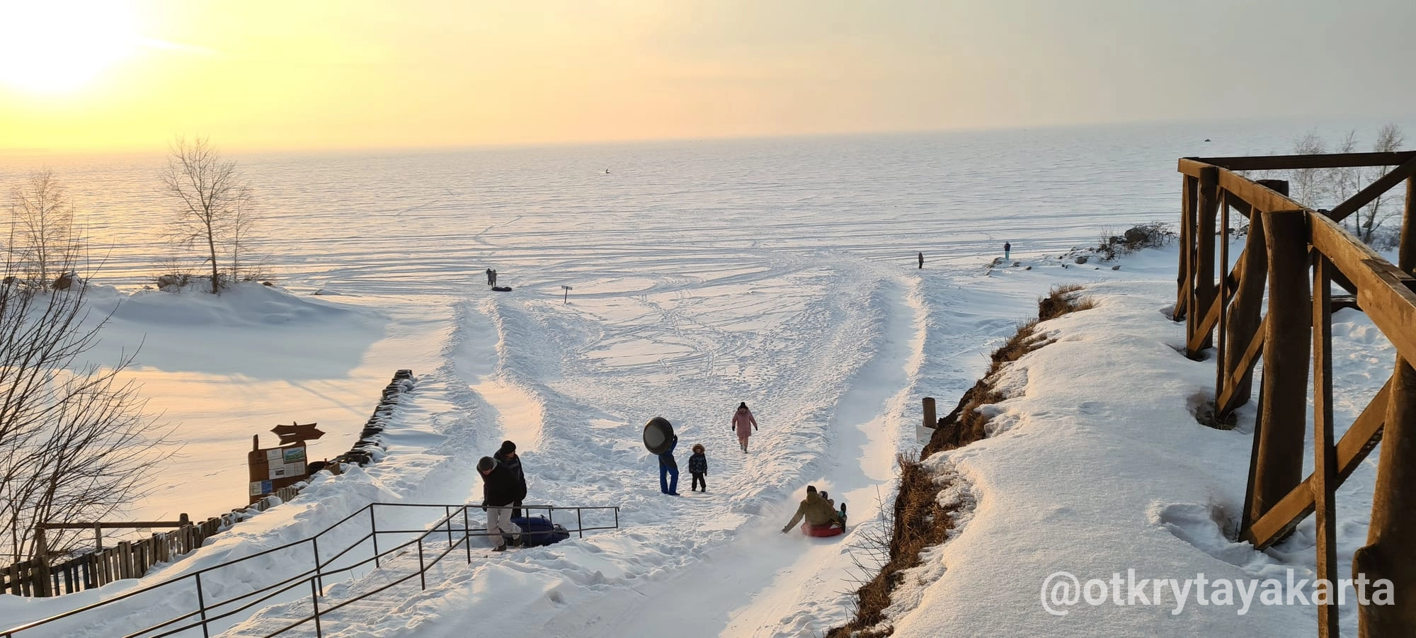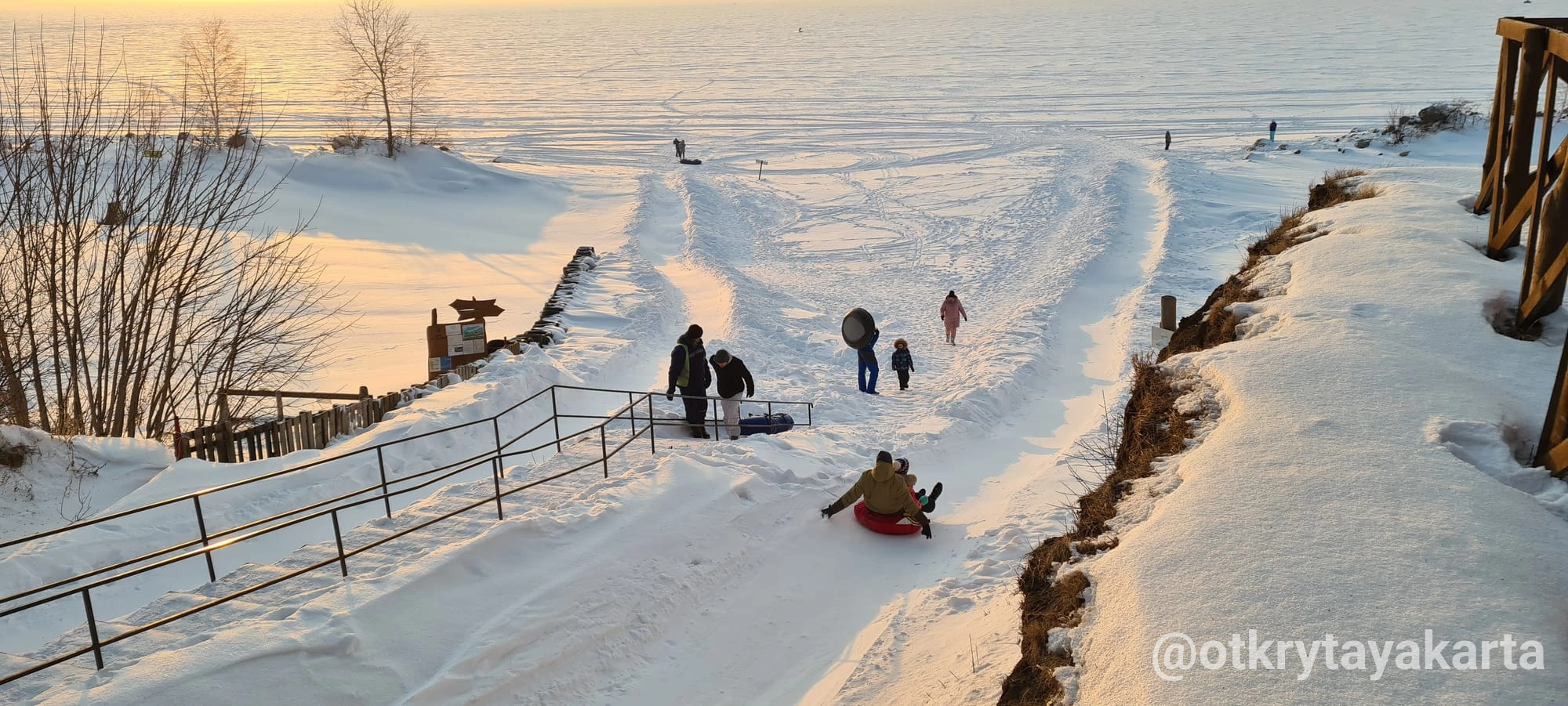 Деревянная горка на берегу — настоящий магнит для любителей ватрушек. Длина спуска здесь достигает 100 метров, и трасса ведет прямо на лед! Кататься можно как со своими ватрушками, так и воспользоваться услугами местного проката.