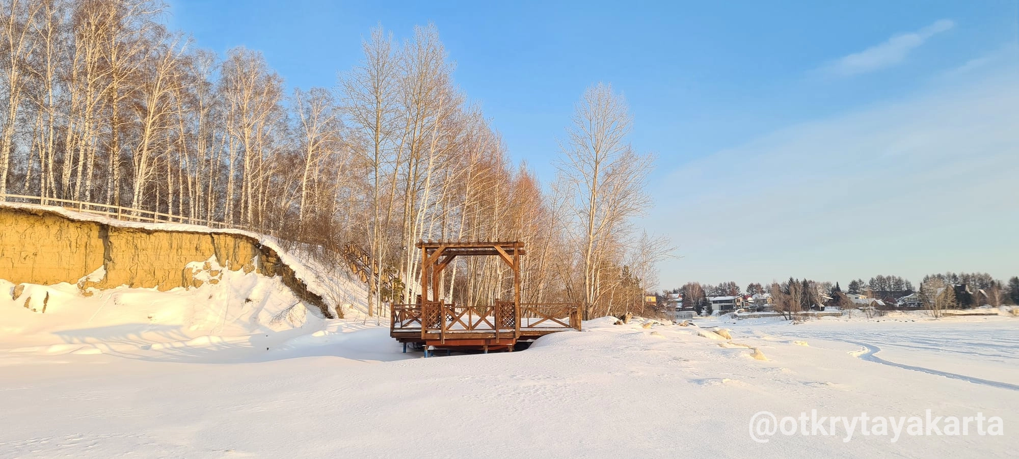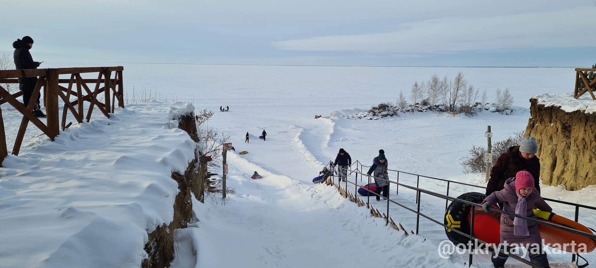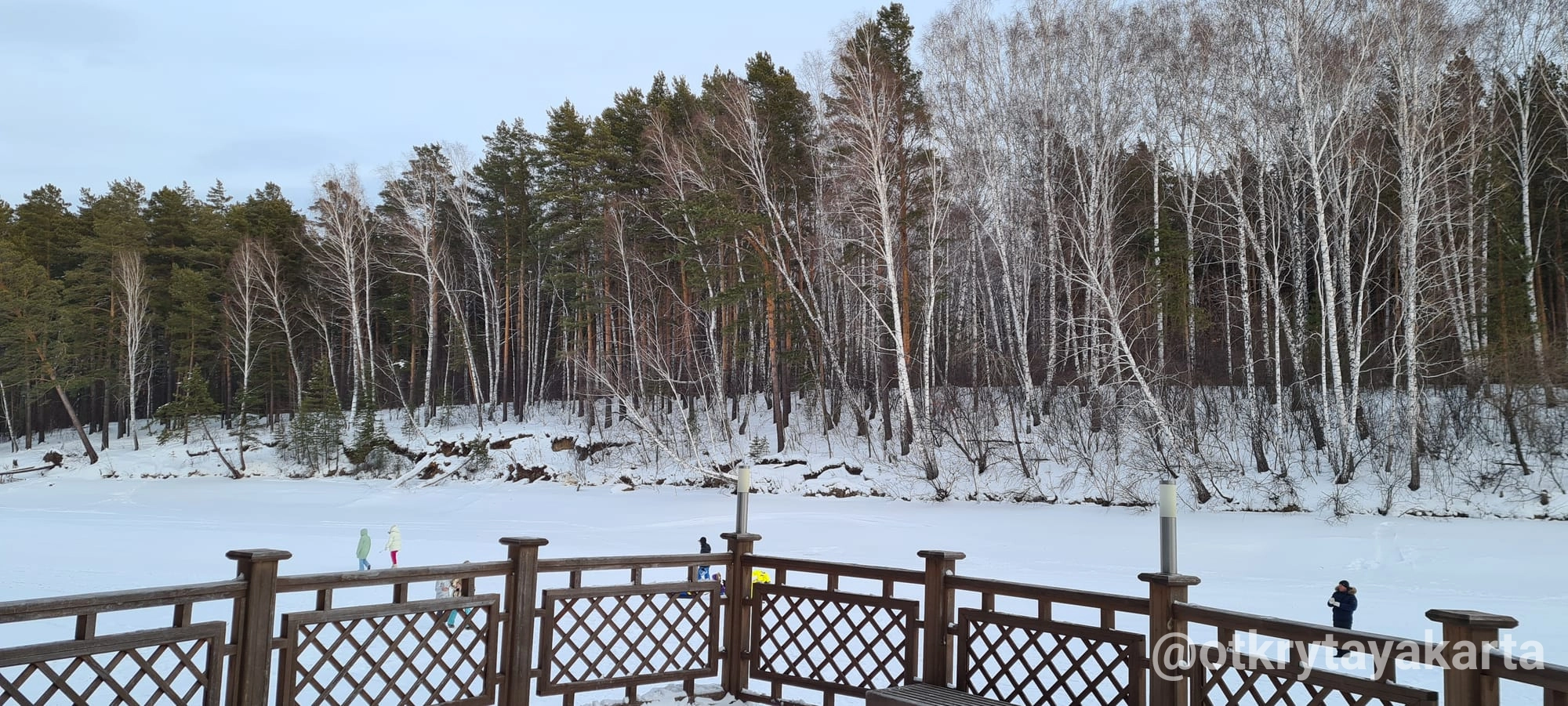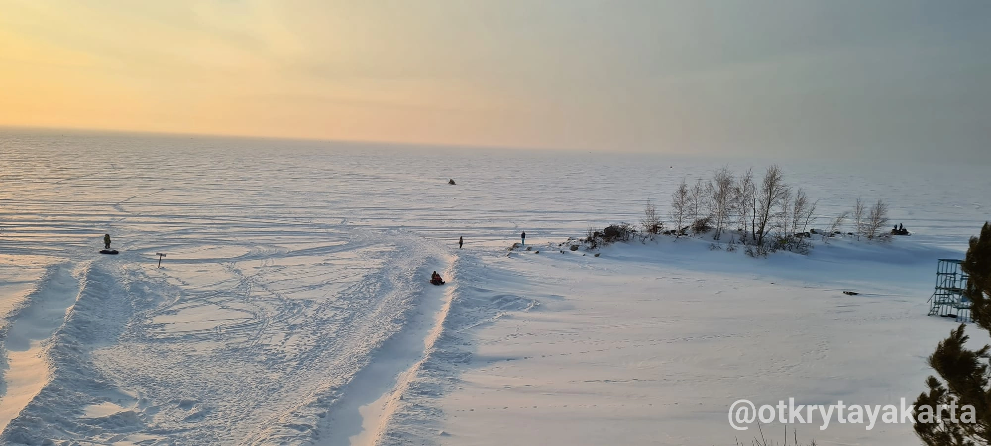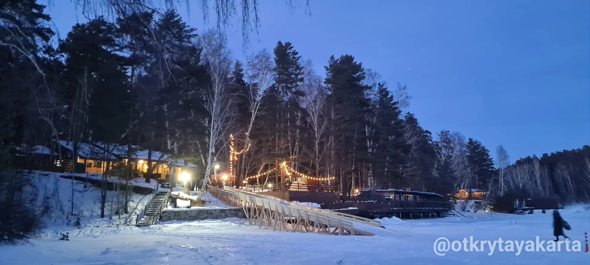 Деревянная горка на берегу — настоящий магнит для любителей ватрушек. Длина спуска здесь достигает 100 метров, и трасса ведет прямо на лед! Кататься можно как со своими ватрушками, так и воспользоваться услугами местного проката.
